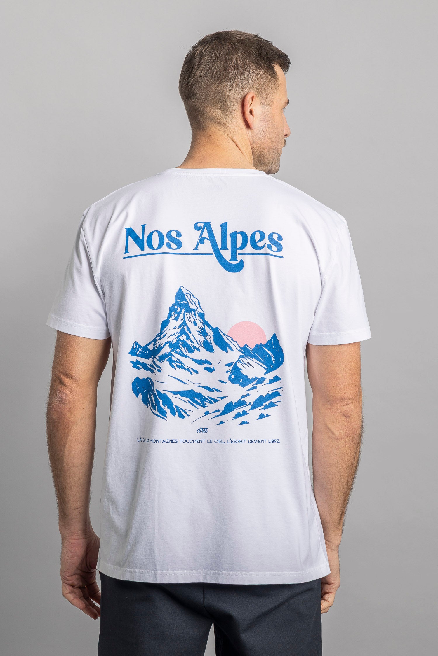 T-shirt made from 100% organic cotton in a relaxed, standard fit. The regular width and slightly longer cut characterize our bestseller. Our 'Nos Alpes' back print adds a special touch – an homage to the mountains and the feeling of freedom where they meet the sky.