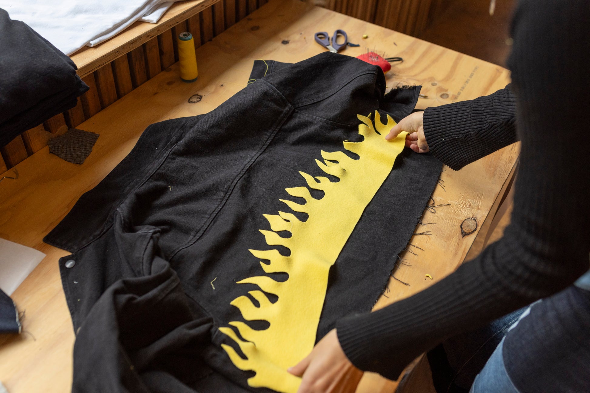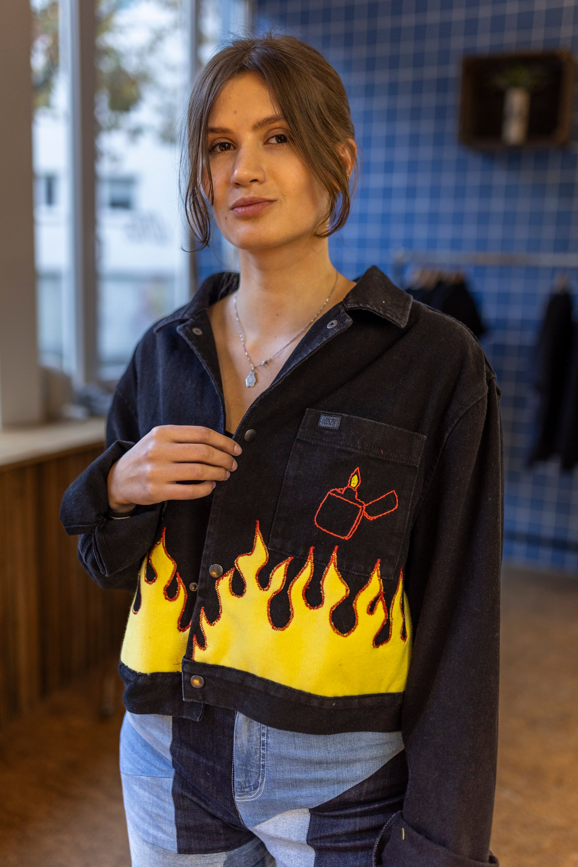 Since this autumn, we have also had our first denim jacket and it is also very popular. "Unfortunately" one jacket had a small defect and could not be sold. Luckily, we have Olha and she has now created this unique masterpiece from it. Absolutely unique, made in Aschaffenburg.
